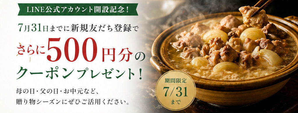 日頃の感謝を込めて、新規友だち登録していただいた方へ、もれなくオンラインショップで使える「500円分のクーポン」(対象商品:水たき)をプレゼントいたします。