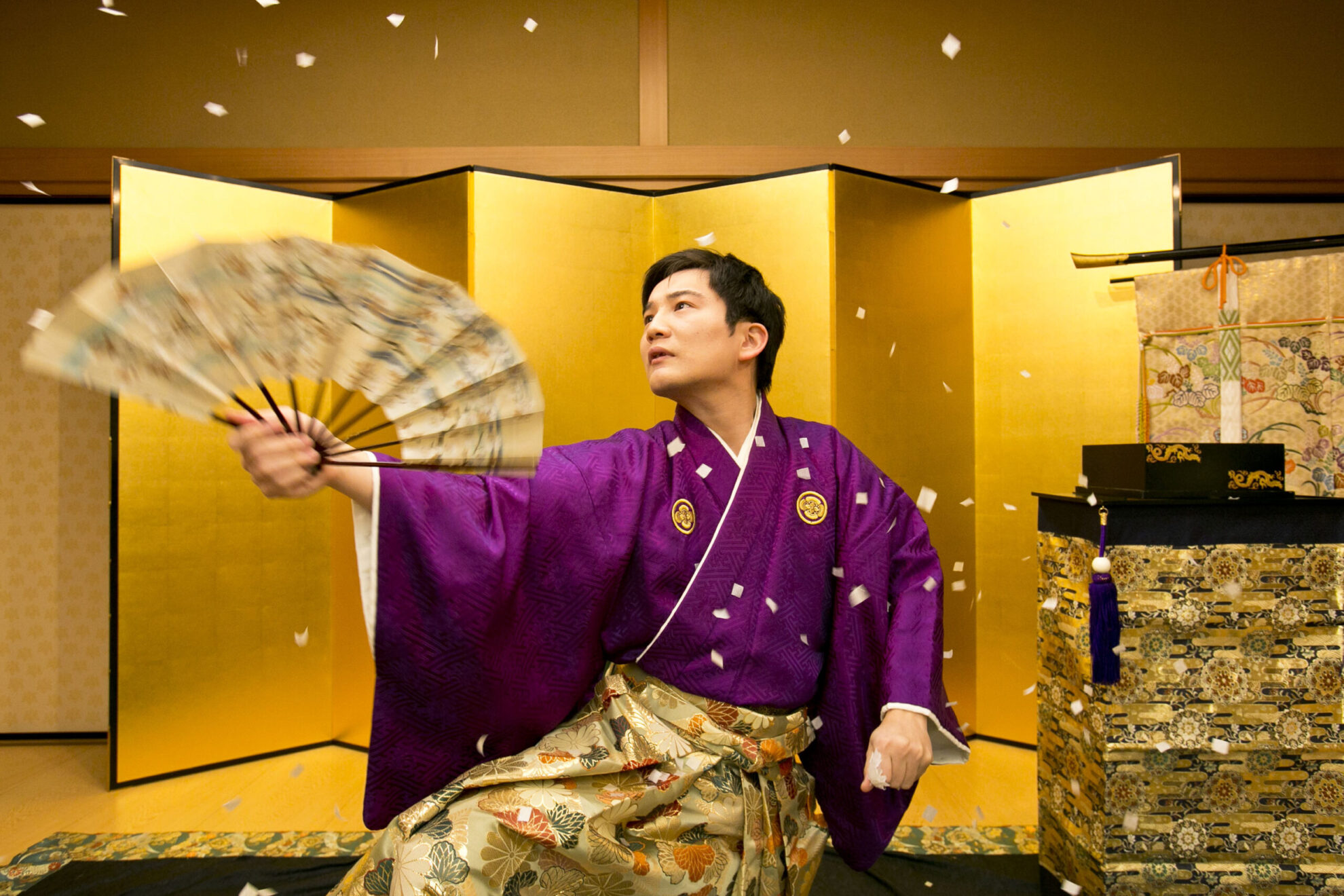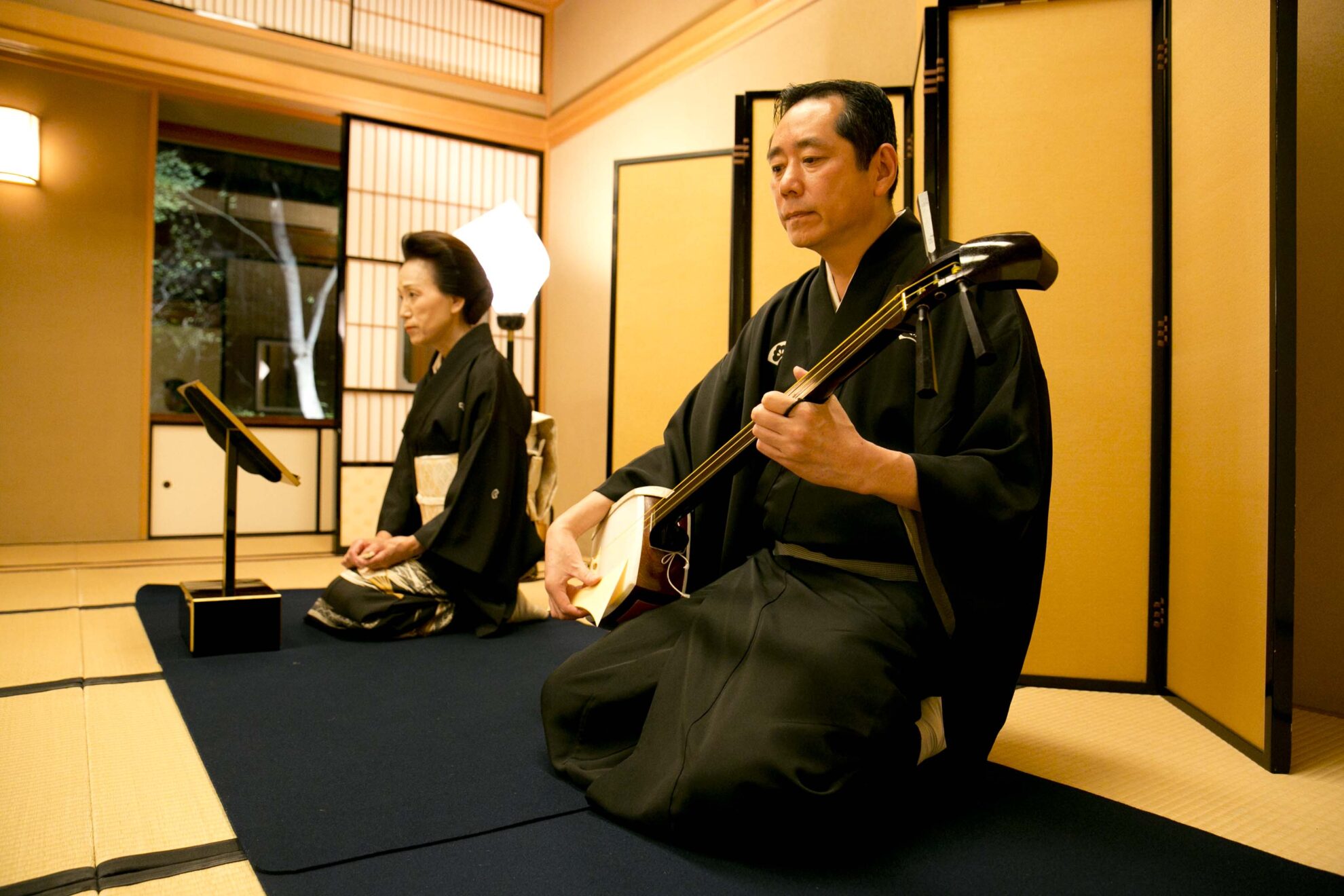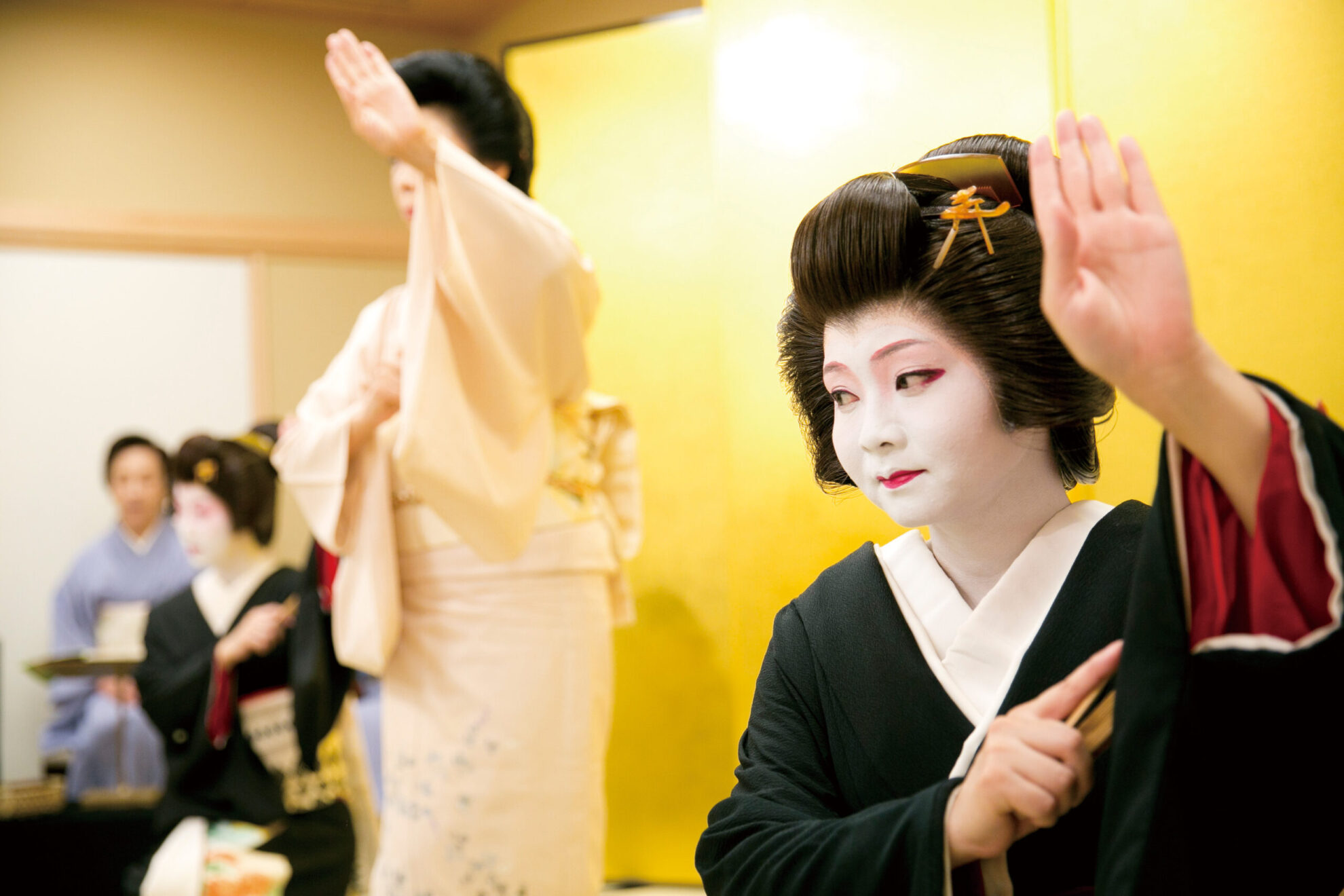 芸者とは、踊りや三味線などの日本の伝統芸能で宴を盛り上げる存在です。地方1名+立方2名の3名構成が一般的です。