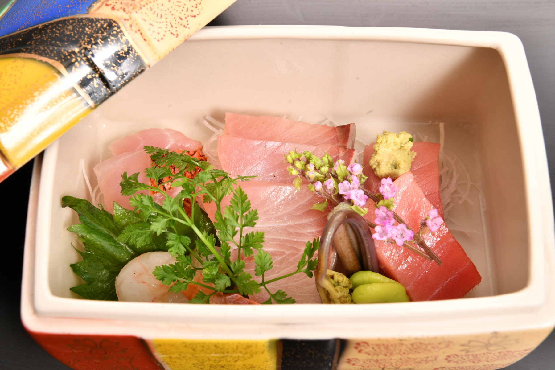 | village planning | yellowtail, Pacific bluefin tuna, yellowfin tuna, red snapper, sweet shrimp bracken, soybean, radish sword, shiso, roasted sake, wasabi, Tosa soy sauce |