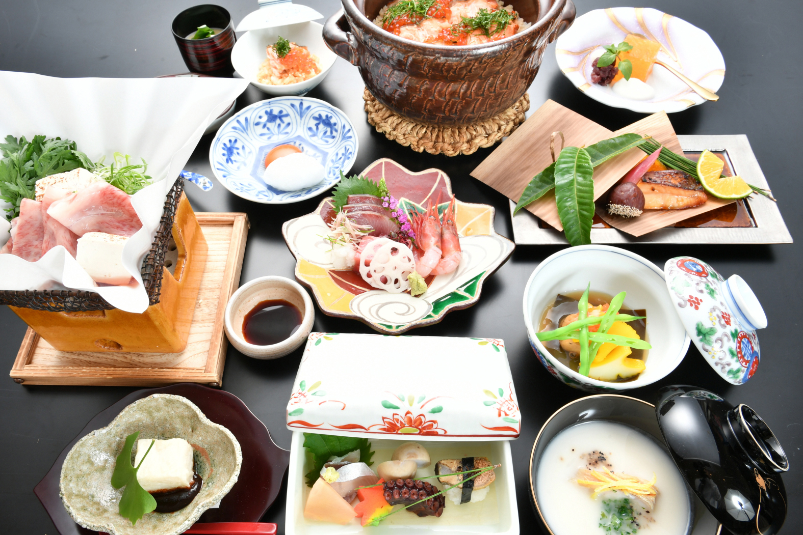 Chopstick service | Celebration appetizer | Soup | Zori (including Ise lobster) | Simmered dish | Iekimono | Deep-fried dish | Chopstick rest| Strong appetizer (Matsusaka beef) | Aka-dashi (red miso soup) | Okahan (red rice) | Ajinomoto (pickles) | Water sweets