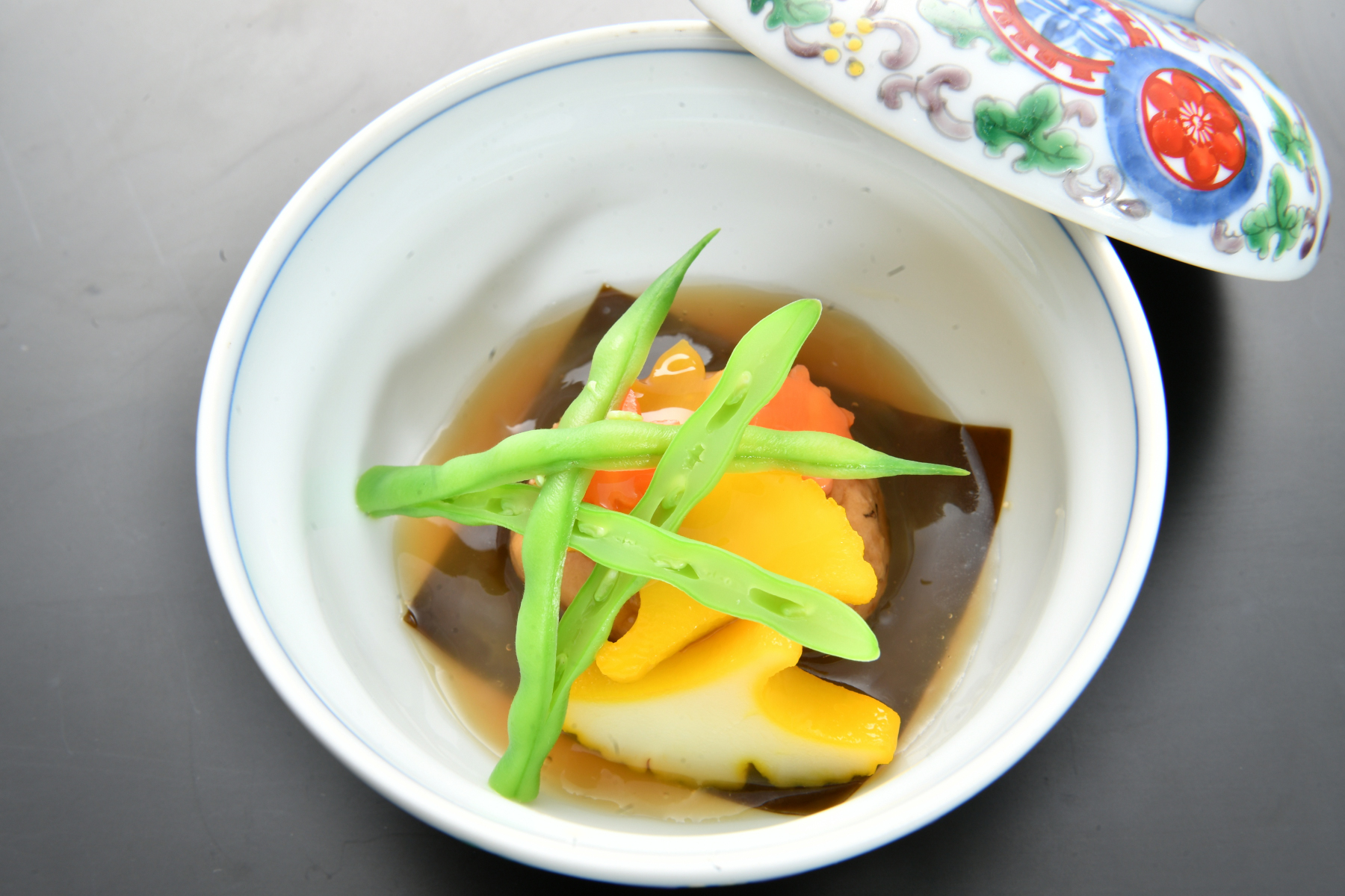 Chopstick service|Ceremony appetizer | Soup | Zori (prawns and other three kinds) | Nimono | Iekimono | Chawanmushi|Steamed egg custard | Aka-dashi (red miso soup) | Okahan (red rice) | Ajinomoto (pickles) | Mizugashi (Japanese sweets)