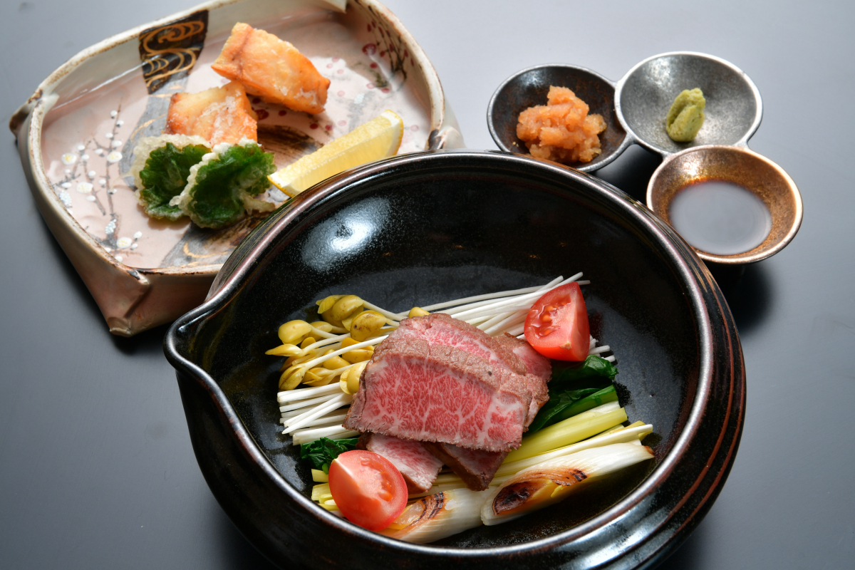 고급 식재료를 듬뿍 사용한 주방장이 추천하는 계절별 가이세키 요리를 기본으로 메인 요리와 식사에 명물인 미즈타키와 잡탕을 즐길 수 있다.